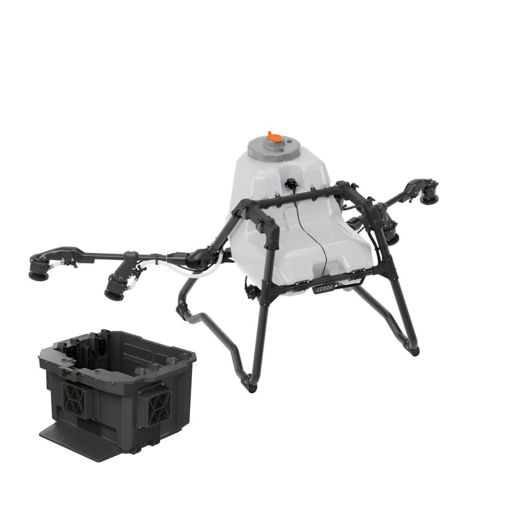 This spraying system is compatible with the DJI Agras T100 spray drone and features a 100 L (26-gallon) spray tank capacity. The system comes equipped with two standard nozzles. To achieve the four-nozzle configuration shown in the product images, you will need to purchase the T100 Mist Nozzle Package, which includes two additional nozzles.